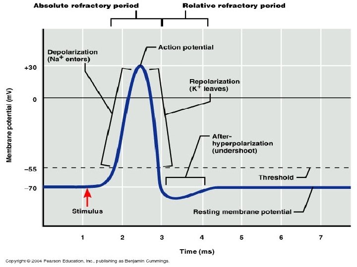 Repolarization • • Sodium ion channels close and become refractory Rapid autodeactivation Depolarization triggers opening of voltage-gated potassium ion channels. K+ ions rush out of the cell, repolarizing and then hyperpolarizing the membrane. Na+ K+ K+ + -