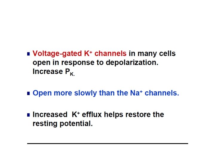 Voltage-gated K+ channels • Voltage-gated K+ channels have only one gate. • This gate is also activated by depolarization. • However, this gate is much slower to respond to the depolarization.