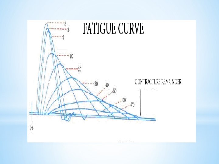 Muscle Fatigue • A fatigue curve is obtained when the nerve muscle preparation is stimulated repeatedly till a fatigue curve is obtained. • A fatigue curve has a prolonged refractory period, low height of contraction no point of • complete relaxation (contracture remainder). • Fatigue is a reversible phenomenon.