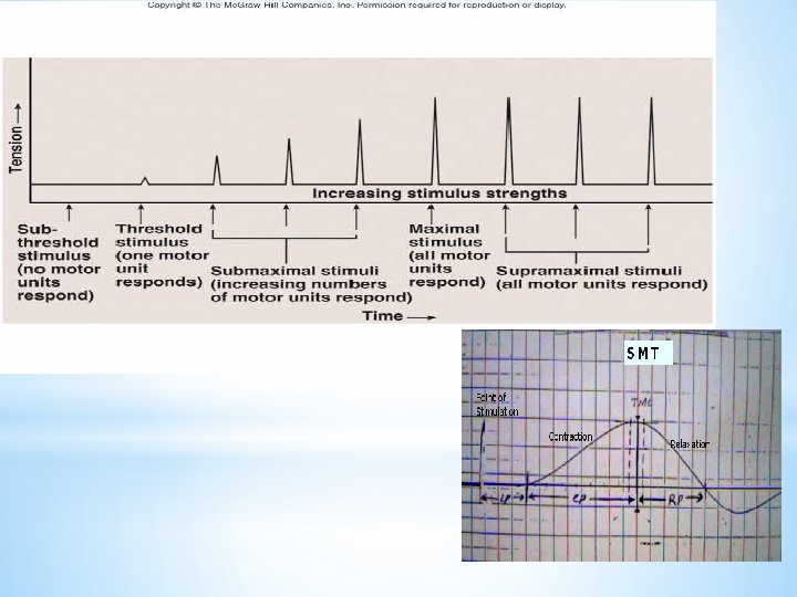 Tetanization Frequency summation and tetanization, with rapid repeated stimulation, • activation of the contractile mechanism occurs repeatedly before any relaxation occurs and the response fuses into one continuous contraction and the whole contraction appears to be smooth called Tetanus • During tetanus the tension developed is 4 times than the individual contraction •