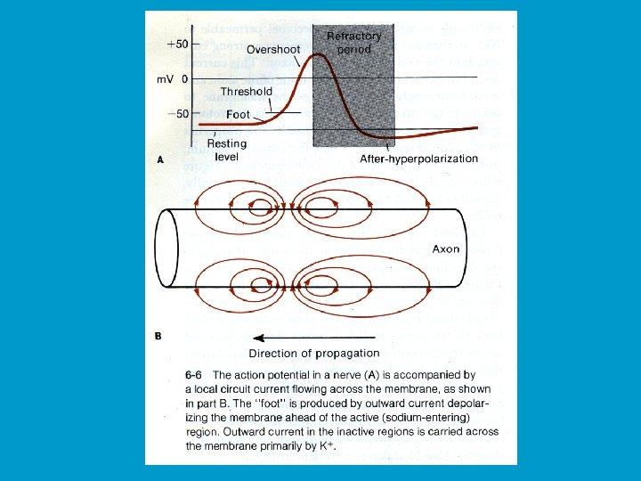 AP propagation cont. n n n The V_G chanels in the neighboring membrane then open, causing that membrane to depolarize. That depolarizes the next piece of membrane, etc. It takes a while for the Na+ channels to return to their voltagesensitive state. Until then, they won’t respond to a second depolarization.