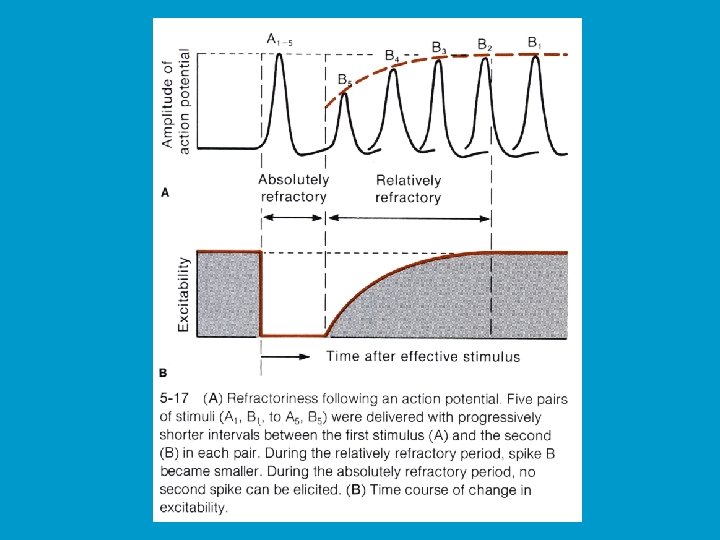Characteristics of action potentials Generation of action potential follows all-or -none principle n Refractory period lasts from time action potential begins until normal resting potential returns n Continuous propagation n spread of action potential across entire membrane in series of small steps salutatory propagation