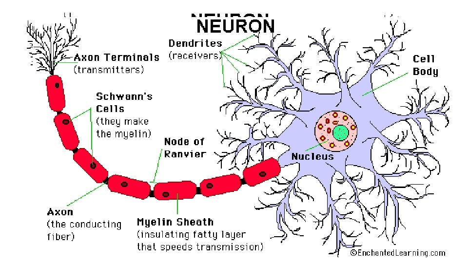 Components of a Neuron • Dendrites are short branches that surround the cell body of the neuron. • Axons carry impulses away from the cell body Myelin sheath Axons may be enclosed in a fatty sheath produced by a Schwann cell or glial cell. Acts as insulation for neurons by preventing the loss of charged ions. Very white in appearance.