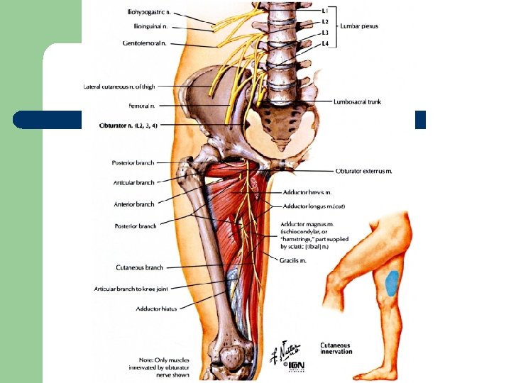 Obturator Nerve l The obturator nerve arises from the lumbar plexus (L 2, 3, and 4) l Emerges on the medial border of the psoas muscle within the abdomen l It divides into anterior and posterior divisions