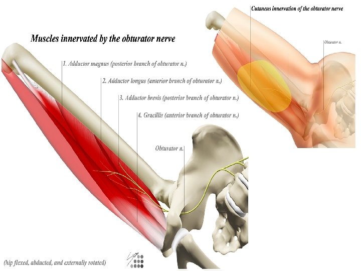 Branches of Obturator Nerve l The posterior division – Supply the knee joint – It gives muscular branches to: l. The obturator externus l. The adductor part of the adductor magnus l. Occasionally to the adductor brevis.