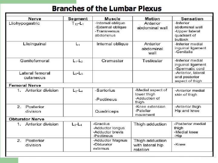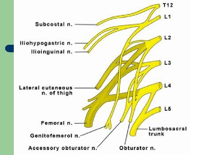 Lumbar Plexus l L 1 variably connected to T 12 (subcostal) and L 2. – Two branches emerge from lateral side of psoas major: l Iliohypogastric: to side of buttock and pubis. l Ilioinguinal: to anterior thigh, scrotum labia majora.