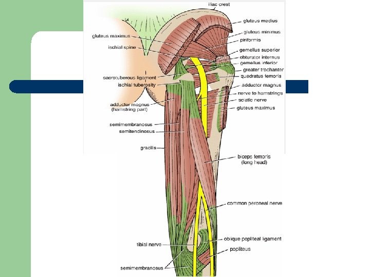 Branches of the sciatic nerve The tibial nerve l The common peroneal nerve l Muscular branches to: l – – the long head of the biceps femoris the semitendinosus the semimembranosus the hamstring part of the adductor magnus.
