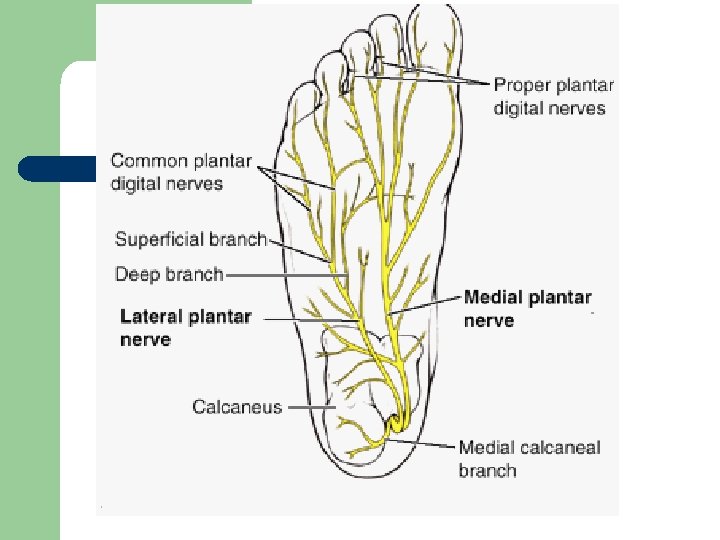 The sensory nerve supply to the skin of the sole l medial side of the heel – l medial two thirds of the sole – l The medial calcaneal branch of the tibial nerve Branches from the medial plantar nerve lateral third of the sole – Branches from the lateral plantar nerve