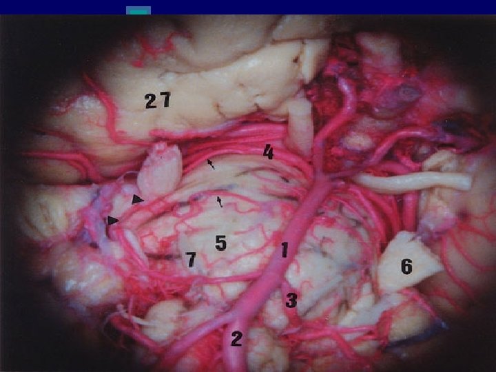 Origen Aparente n Las dos raíces emergen de la protuberancia en el limite entre su cara inferior y los pedúnculos cerebelosos medios. n La raíz motora, mucho mas pequeña que la raíz sensitiva, sale del neuroeje por dentro de la raíz sensitiva, cerca del borde superior de la raíz.