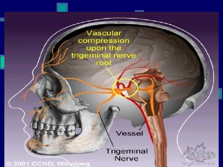 ALTERACIONES n Son alteraciones frecuentes las Neuralgia y la parálisis del trigémino. n Neuralgia del Trigémino: Puede se de carácter esencial o bien secundario o sintomática. n En el primer caso no se logra determinar una causa etiológica y por ello se llama también idiopatica, en el segundo caso se determina una causa que explica racionalmente la neuralgia.