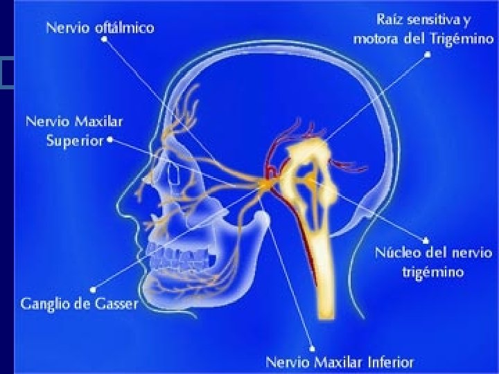 n Características de la Neuralgia esencial del V par: Se manifiesta con mayor frecuencia durante la cuarta-quinta década de la vida, es mas frecuente en el sexo femenino. n Afecta con mayor frecuencia la primera y la segunda rama, menos frecuentemente la primera y tercera rama juntas y por ultimo la tercera; el dolor es de tipo fulgurante y paroxístico con duración inferior a un minuto, es repetitivo, su intensidad y el temor a su producción obliga al paciente a evitar gestos, hablar o ingerir alimentos.