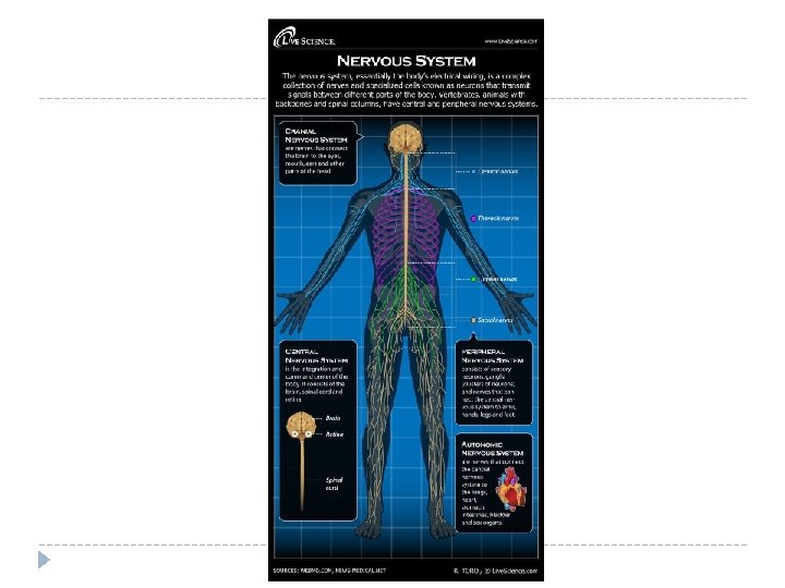 Neurons � The neurons are the only cells that react to a stimulus � A stimulus is a change in the environment that results in nerve excitation � Ex. sun shining in your eyes or hearing a sound � Nerves are structures that help transmit information between the central nervous system and the various regions of the body � https: //www. youtube. com/watch? v=Ibzfwtdtong