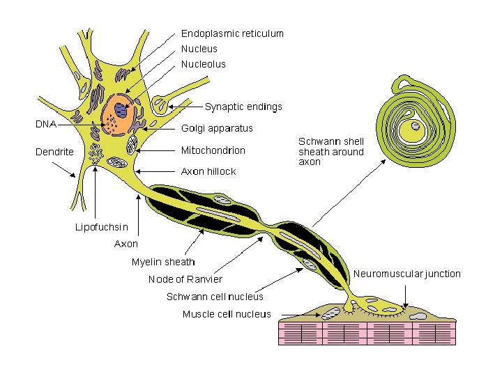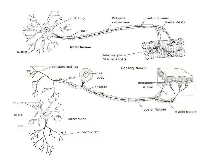 What are the parts of a nerve? • • • Axon Dendrite Cell Body Nucleus Myelin Node of Ranvier