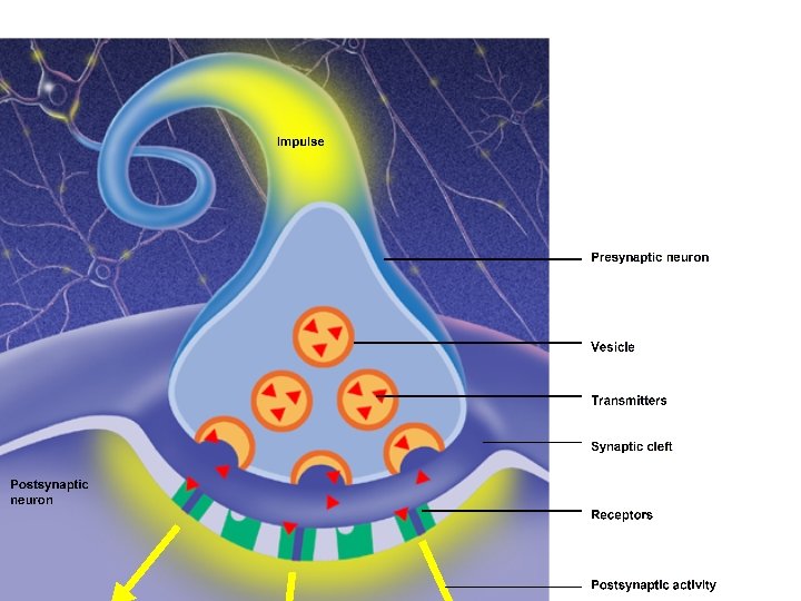 How are Neurotransmitters released? • Action potential causes Ca+ ions to enter the terminal end of the axon. • Synaptic vesicles then fuse with the membrane. • Contents are released into the synaptic cleft. • Neurotransmitters are decomposed and the vesicles retreat to be refilled.