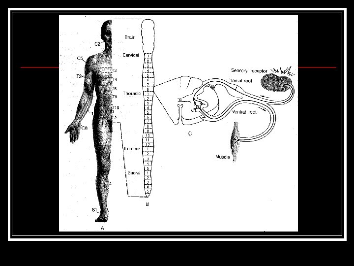 Spinal Cord 31 segments with pairs (left & right) nerves carrying sensory and efferent information n Functions n n n Ascending and descending neural tracts Interneurons responsible for spinal reflexes (relatively simple decisions) n Link sensory information (e. g. , pain) with motor response (e. g. , muscle contraction)