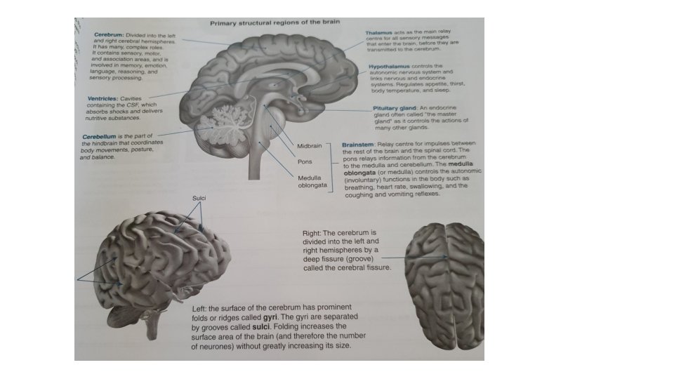 Cerebrum • Two central hemisphere – corpus callosum – outer layer of cells called cerebral cortex. • Conscious thought, actions, emotional responses, intelligence etc. • Sensory areas – action potential from sensory receptors • Association areas – compares sensory inputs with previous experience and judges an appropriate response. • Motor area – send action potential to muscle and glands. • Left hand sides control right hand side of body and vice versa.