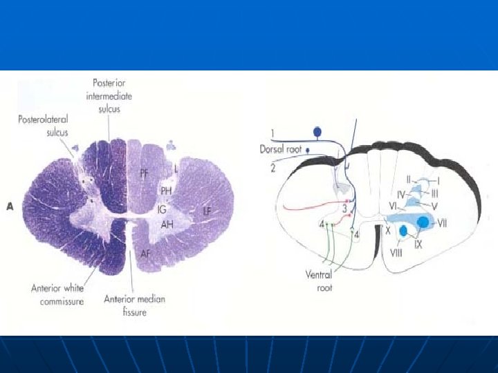 Gray matter The laminas: Spinal cord gray matter is arranged in layers, there are 10 Rexed’s lamina: The posterior horn is formed by lamina Ⅰ to Ⅵ, The intermediate zone corresponding to lamina Ⅶ, The anterior horn is composed laminae Ⅷ and Ⅸ, lamina Ⅹ is the gray matter surrounding the central canal.