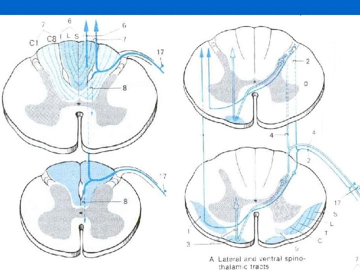 Ascending tracts Spinothalamic Tract Conduct Pain, temperature and simple touch sensation of trunk and limbs Origin: Laminae Ⅰ, Ⅳ~Ⅶ of spinal cord Termination: Dorsal thalamus