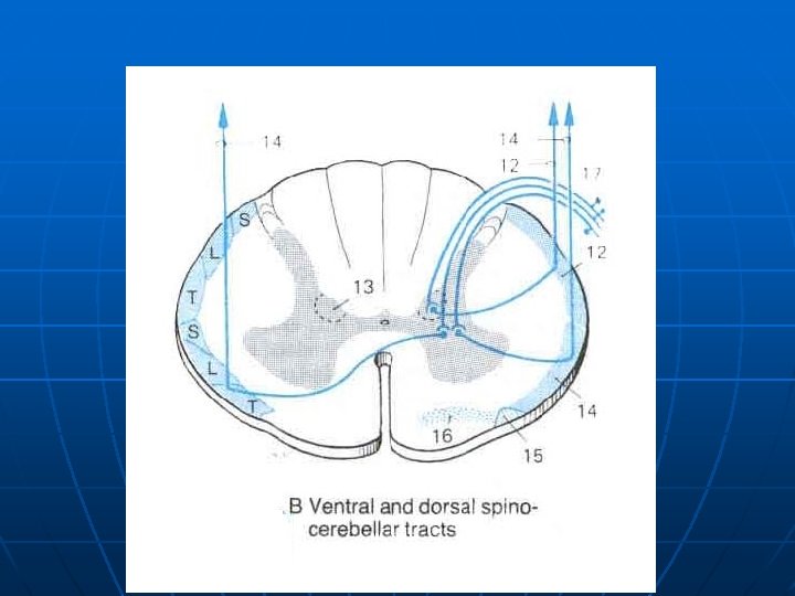 The spinal cord ① ascending tracts: Tracts origin position Termination Function Pain, temperature Spinothalamic Tract Laminae Ⅰ, Ⅳ~Ⅶ Lateral and ant. Funiculus Dorsal thalamus and simple touch sensation of trunk and limbs Posterior. nucleus thoracicus spinocerebellar Anterior. spinocerebellar LaminaeⅤ~Ⅶ Cerebellum Lateral Funiculus Cerebellum subconscious proprioception from lower part of trunk And lower limb