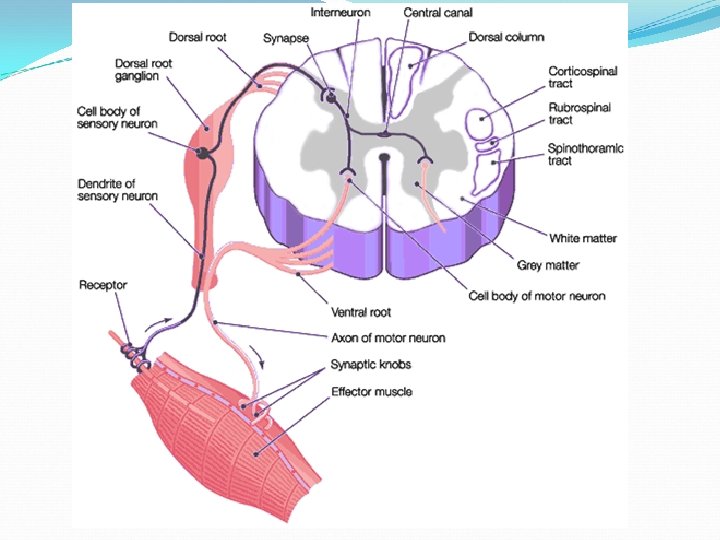 Reflex Arc gure 48. 4 2 Sensors detect a sudden stretch in the quadriceps. 3 Sensory neurons convey the information to the spinal cord. Cell body of sensory neuron in dorsal root ganglion Quadriceps muscle 4 The sensory neurons communicate with motor neurons that supply the quadriceps. The motor neurons convey signals to the quadriceps, causing it to contract and jerking the lower leg forward. Gray matter 5 Sensory neurons from the quadriceps also communicate with interneurons in the spinal cord. White matter Hamstring muscle Spinal cord (cross section) Sensory neuron 1 The reflex is initiated by tapping the tendon connected to the quadriceps (extensor) muscle. Motor neuron Interneuron 6 The interneurons inhibit motor neurons that supply the hamstring (flexor) muscle. This inhibition prevents the hamstring from contracting, which would resist the action of the quadriceps.