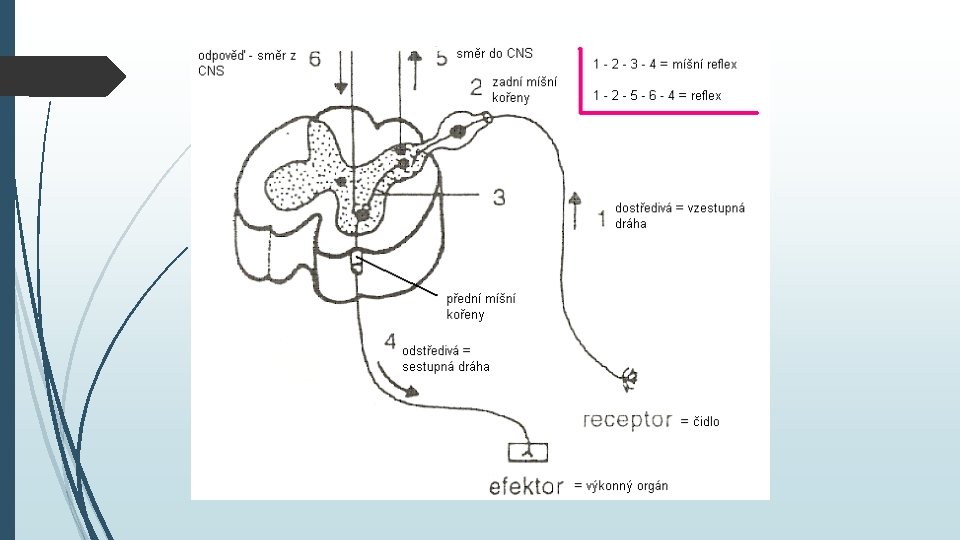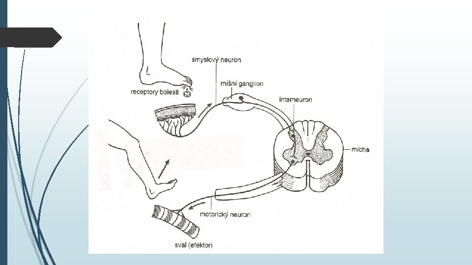 Reflexní oblouk odpověď organismu na změny vnějšího a vnitřního prostředí stavebním základem: reflexní oblouk = nejjednodušší spojení 2 neuronů neuronu dostředivého a neuronu odstředivého 1. receptor (čidlo) 2. dostředivé dráhy (vzestupné, vstupují do míchy zadními míšními kořeny)) 3. CNS (mozek a mícha) 4. odstředivé dráhy (sestupné, vystupují předními míšními kořeny) 5. výkonný orgán = efektor (nejčastěji sval)