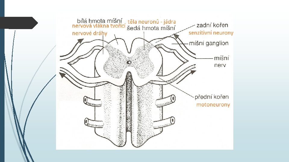 Páteřní mícha = hřbetní mícha 45 cm, v páteřním kanálu, navazuje na prodlouženou míchu Krční, hrudní, bederní, křížový, kostrční Končí na úrovni 2. bederního obratle šedá hmota tvoří tvar písmene H přední (motorické) rohy míšní zadní (senzitivní) rohy míšní – ty se pak spojují v míšní nervy (31 párů)