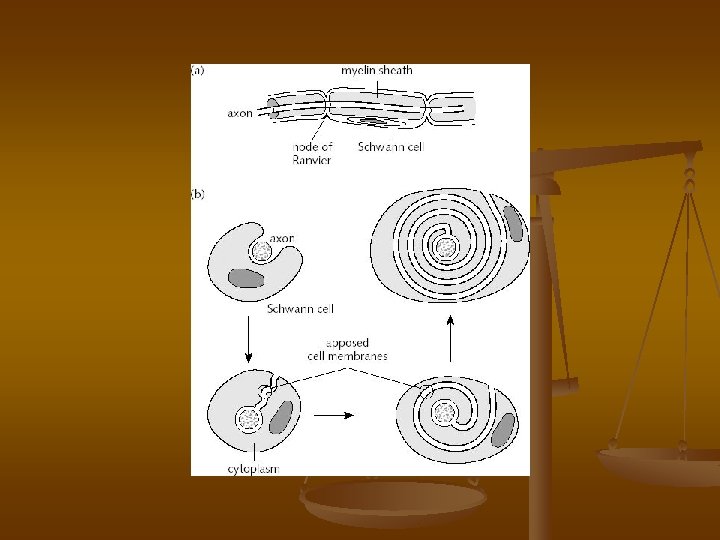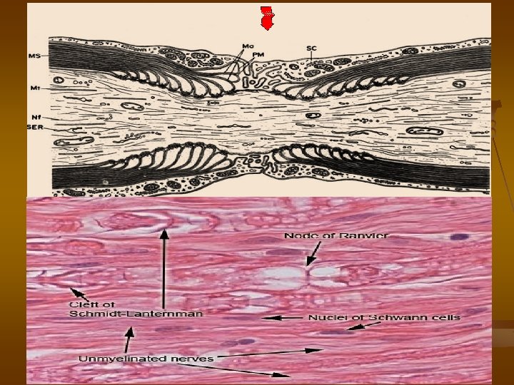 Myelinová pochva Ø 1 - 20 µm Ø 70 % H 2 O, lipidy, proteiny Ø koncentricky uspořádané lamely lipoproteinu ØRanvierovy zářezy; internodia (Ranvier. segmenty, 0, 6– 2, 0 mm )