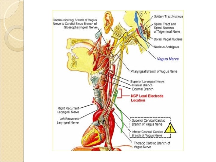 Anatomia N. vagus. 4 ◦ ◦ 2 kjarnar í heilastofni Nucleus N. Trigeminus. Nucleus solitarius Dorsal motor nucleus Nucleus ambiguus ganglion ◦ Superior ◦ Inferior 4 ◦ ◦ gerðir taugaþráða Somatic afferent Visceral afferent Parasymphatic Motor efferent Margar greinar