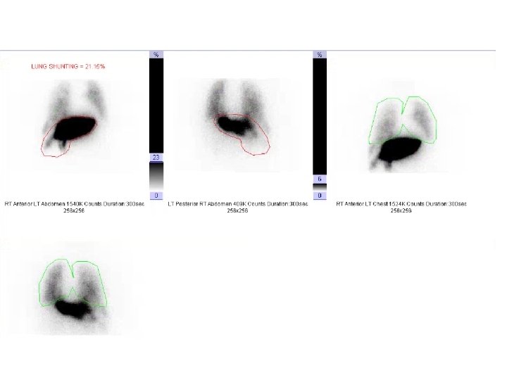 Dose reduction for lung shunting • BSA method – Dosage (GBq) = [(BSA – 0. 2) + (% tumor involvement/100)] * (%treatment area represents of whole liver/100) (1 -(%lung shunt reduction/100)) • Recommended lung shunt reduction – <10% = no reduction – 10% - 15% = 20% dosage reduction – 15% - 20% = 40% dosage reduction – >20% = no treatment • No reduction for lung shunting may be considered if the lung dose is less than 25 Gy per treatment and 50 Gy cumulative dose to the lung. • Lung dose (Gy) = (dosage in GBq * lung shunt fraction) * 50/ lung mass (Kg) Assume lung mass is 1 kg • A 25% dosage reduction may be considered when teating patients with a total bilirubin >2