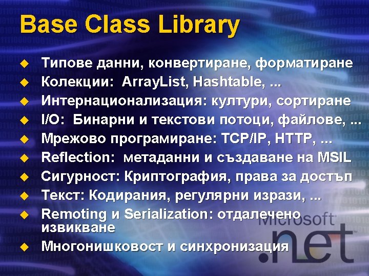 Пакетите от Base Class Library System Collections Security Configuration Service. Process Diagnostics Text Globalization Threading IO Runtime Interop. Services Net Reflection Remoting Resources Serialization