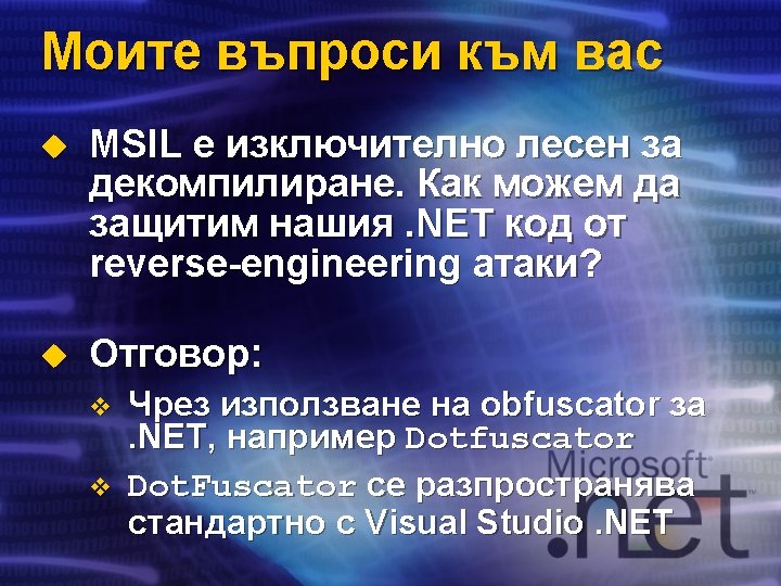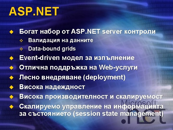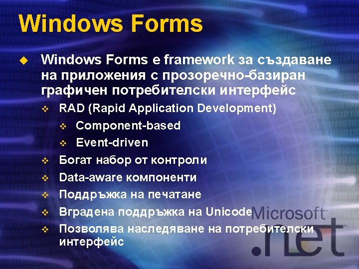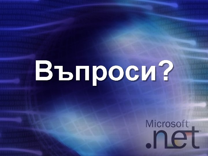 . NET Framework – ресурси u Web-сайтове: v Официален сайт на. NET Framework – http: //msdn. microsoft. com/netframework/ v Microsoft. NET Framework Community – v v ASP. NET – http: //www. asp. net/. NET Windows Forms – v O’Reilly. NET Community Site – v Microsoft Patterns and Practices – v Code Project – http: //www. codeproject. net/ http: //www. gotdotnet. com/ http: //www. windowsforms. net/ http: //www. ondotnet. com/ http: //msdn. microsoft. com/practices/