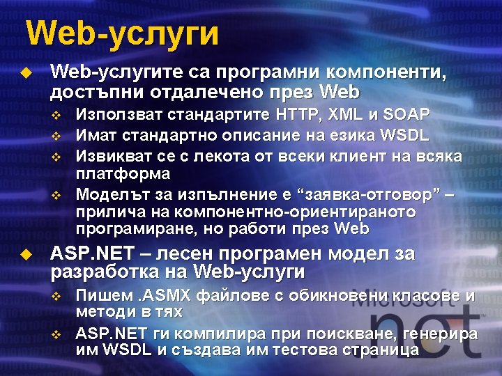 Demo 3 u Създаване на проста Web -услуга чрез: v v v ASP. NET (Web Services) MS Internet Information Server Visual Studio. NET