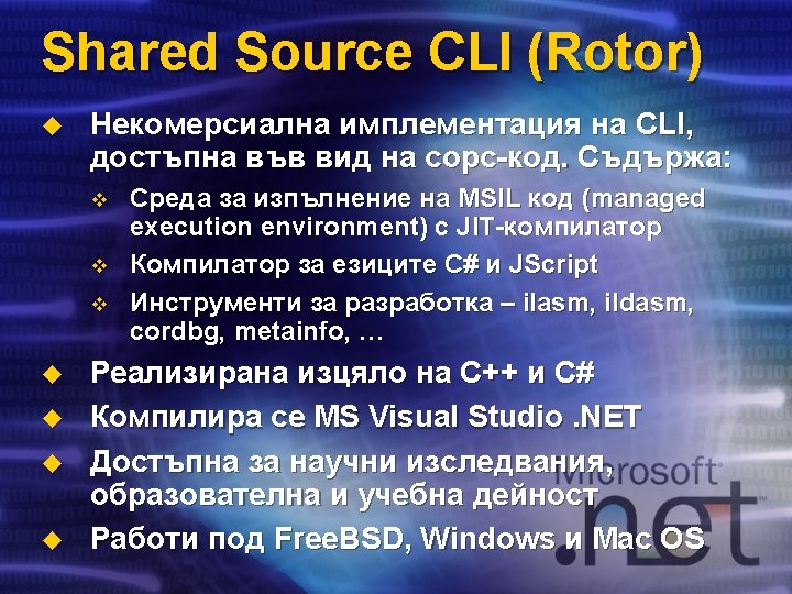 . NET Framework – Resources u u Web-сайтове: v Mono – Open Source. NET Framework – v Rotor – MS Shared Source. NET CLI – v Курс по. NET Framework в Софийски Университет – http: //www. nakov. com/dotnet/ http: //www. go-mono. org/ http: //msdn. microsoft. com/net/sscli/ Нюзгрупи: v Нюзгрупата на. NET Framework – v Българската нюзгрупа на Microsoft – news: //msnews. microsoft. com/microsoft. public. dotnet. framework news: //msnews. microsoft. com/microsoft. public. bg. developer