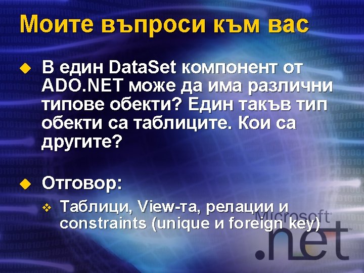 . NET Framework Data Access Layer v v v Достъп до релационни бази данни Disconnected модел на данните Работа с XML ADO. NET and XML. NET Framework (Base Class Library) Common Language Runtime Operating System