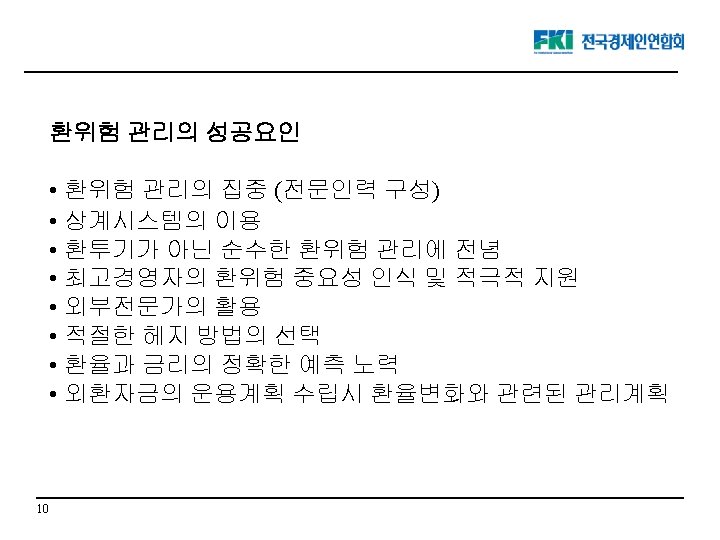 • 환위험의 외부적 관리전략 현물환 (spot exchange) 선물환 (forward exchange) = 현물환 + 스왑포인트 통화옵션 (currency option) ü Range Forward (Risk Reversal) ü Target Forward ü Seagull ü Enhanced Forward ü 기타 통화스왑 (currency swap) 기타 – 환변동보험 (foreign exchange fluctuation insurance) 9