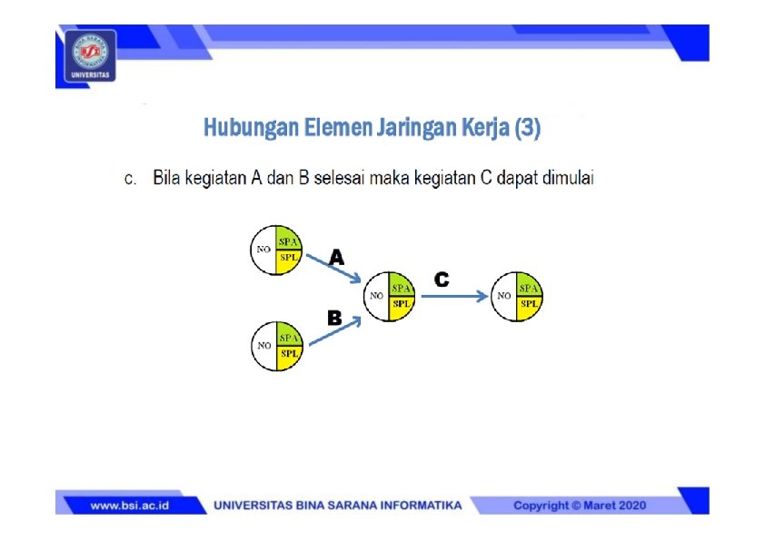 Hubungan Elemen Jaringan Kerja (2) b. Hubungan Paralel, Kegiatan A dan Kegiatan B dapat dilaksanakan bersama-sama A B A A B B Jika sebuah kegiatan bisa dimulai/diselesaikan tanpa perlu menunggu kegiatan lain selesai. • Memiliki satu peristiwa awal bersama • Memiliki satu peristiwa akhir dan satu peristiwa awal bersama • Memiliki peristiwa awal yang berlainan dan peristiwa akhir yang berlainan