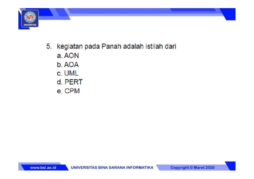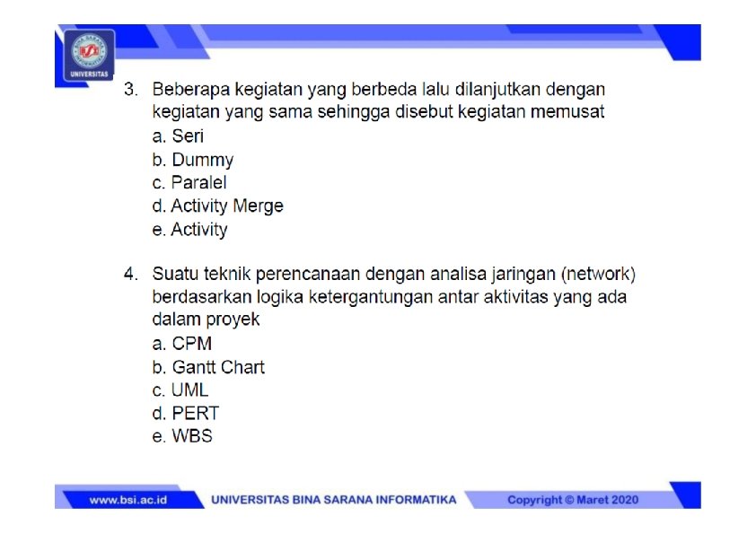 CATATAN PENGUAT MATERI KULIAH Soal Latihan dan Soal ujian dapat dari sumber materi slide tiap pertemuan ditambah dari luar slide pertemuan (dari buku-buku referensi) maka Mahasiswa diharapkan membaca dan mencari materi tambahan yang masih terkait dengan topik pertemuan dari sumber referensi buku Manajemen Proyek Sistem Informasi untuk menambah wawasan keilmuan agar nantinya dapat menjawab soal-soal latihan maupun soal ujian yang sumbernya bukan berasal dari slide pertemuan.