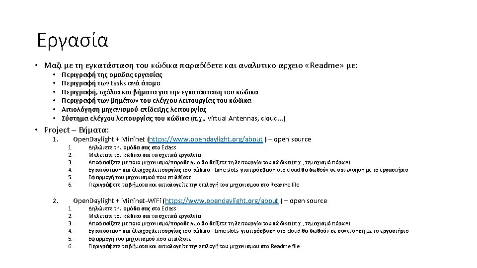 Εργασία • Δημιουργείτε ομάδες και δουλεύετε με ανάθεση tasks ανά άτομο. Επιλέγετε να δουλέψετε σε ένα απο τα 3 project • Τελική παράδοση 15/6/2019 • Project: 1. Open. Daylight - SDN (https: //www. opendaylight. org/about ) (ομάδες 4 -6 ατόμων) 1. 2. 3. Basic functionality Applications (Northbound) – 2 applications MININET 2. Open. Daylight - SDN (https: //www. opendaylight. org/about ) (ομάδες 4 -6 ατόμων) 1. 2. 3. Basic functionality Applications (Northbound) – 2 applications MININET-WIFI