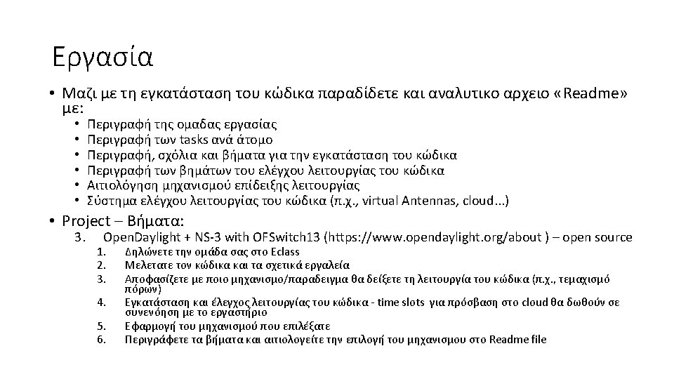 Εργασία • Δημιουργείτε ομάδες και δουλεύετε με ανάθεση tasks ανά άτομο. Επιλέγετε να δουλέψετε σε ένα απο τα 2 project • Τελική παράδοση 15/6/2019 • Project: 3. Open. Daylight - SDN (https: //www. opendaylight. org/about ) (ομάδες 4 -6 ατόμων) 1. 2. 3. Basic functionality Applications (Northbound) – 1 application NS-3 with OFSwitch 13