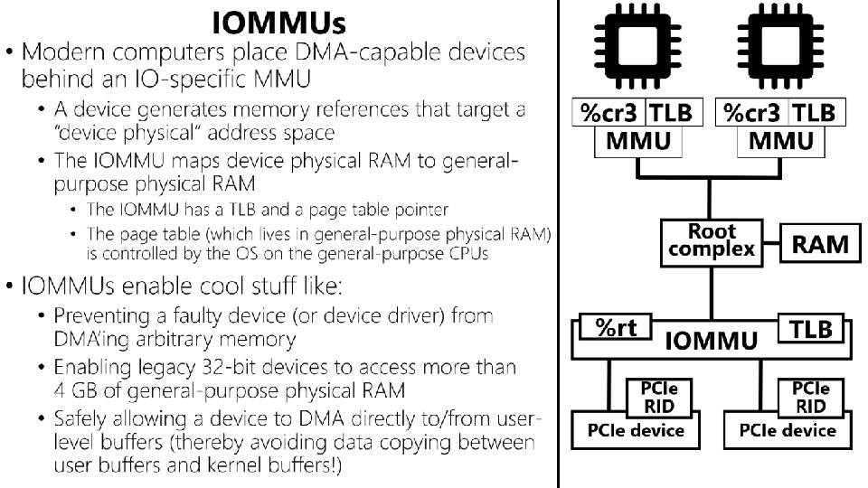 IOMMUs • Modern computers place DMA-capable devices behind an IO-specific MMU • A device generates memory references that target a “device physical” address space • The IOMMU maps device physical RAM to generalpurpose physical RAM %cr 3 TLB MMU • The IOMMU has a TLB and a page table pointer • The page table (which lives in general-purpose physical RAM) is controlled by the OS on the general-purpose CPUs %cr 3 TLB MMU Root complex RAM • IOMMUs enable cool stuff like: • Preventing a faulty device (or device driver) from DMA’ing arbitrary memory • Enabling legacy 32 -bit devices to access more than 4 GB of general-purpose physical RAM • Safely allowing a device to DMA directly to/from userlevel buffers (thereby avoiding data copying between user buffers and kernel buffers!) %rt IOMMU PCIe RID PCIe device TLB PCIe RID PCIe device