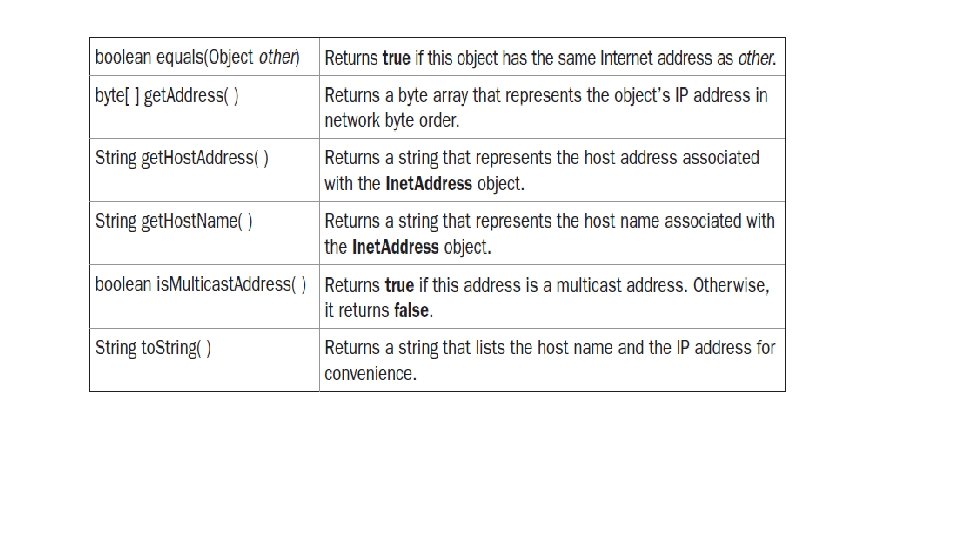 • The get. Local. Host( ) method simply returns the Inet. Address object that represents the local host. • The get. By. Name( ) method returns an Inet. Address for a host name passed to it. • If these methods are unable to resolve the host name, they throw an Unknown. Host. Exception. • On the Internet, it is common for a single name to be used to represent several machines. • The get. All. By. Name( ) factory method returns an array of Inet. Addresses that represent all of the addresses that a particular name resolves to. • It will also throw an Unknown. Host. Exception if it can’t resolve the name to at least one address. • Inet. Address also includes the factory method get. By. Address( ), which takes an IP address and returns an Inet. Address object.