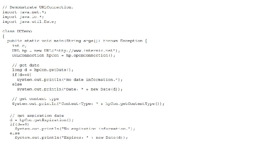 Http. URLConnection • Java provides a subclass of URLConnection that provides support for HTTP connections. This class is called Http. URLConnection. • You can also use any of the several methods defined by Http. URLConnection. Here is a sampling:
