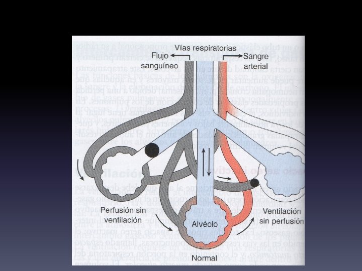 Desajustes entre ventilación perfusión (V/Q) • Las propiedades del intercambio gaseoso de los pulmones dependen de la igualdad entre ventilación y perfusión: cantidades iguales de aire y sangre que entran en la parte respiratoria del pulmón. • Tanto un espacio aéreo inactivo como la derivación provocan un desajuste en la ventilación perfusión. • Puede ser que se produzca por alveolos que son ventilados pero no perfundidos (derivación) como en la embolia pulmonar. • Puede ser que tengamos alveolos no ventilados pero perfundidos, como en las neumopatías obstructivas.