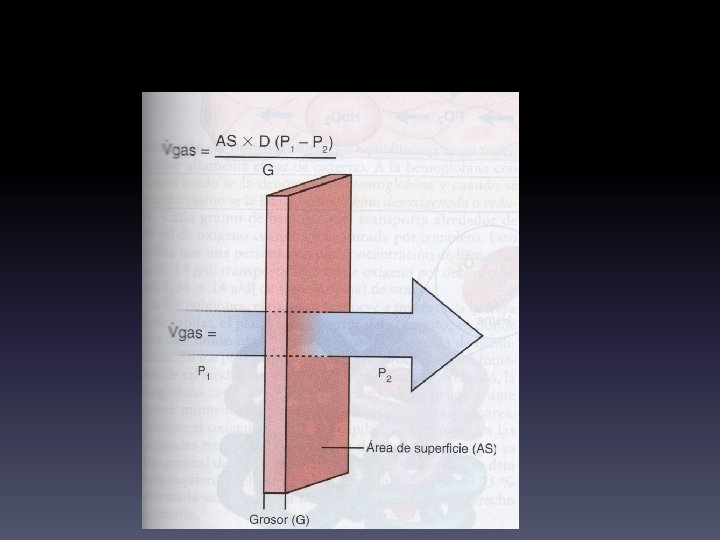 Difusión: • Se refiere al movimiento de los gases a través de la membrana alveolocapilar. Puede describirse por medio de la ley de Fick de la difusión: – Establece que el volumen de un gas (Vgas) que se difunde a través de la membrana por unidad de tiempo es directamente proporcional a la diferencia de la presión del gas (P 1 -P 2), el área de superficie (AS) de la membrana y el coeficiente de difusión del gas y es inversamente proporcional al grosor de la membrana.