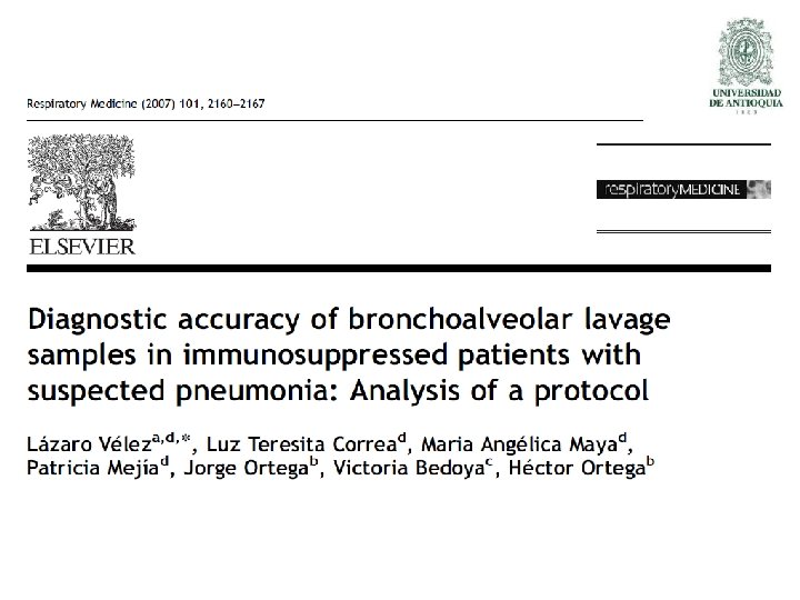 Caracterización clínica y etiológica de la NAC que requiere hospitalización. Valle de Aburrá 2005 -2006 Vélez LA, Rueda ZV, Aguilar YA, Ortega H, González G, Arroyave M, Correa LT, Rojas EM, Montúfar F, Betancur CA, Upegui JJ, Medina LA, Bedoya F, Tobón R, Grupo Investigador de Problemas en Enfermedades Infecciosas (GRIPE) Grupo de Epidemiología Estudio cofinanciado Universidad de Antioquia – Colciencias, Código: 1115 -04 -16498