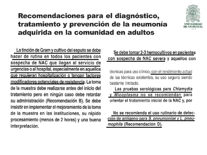 Costos de la NAC n USA: n n Nueva Zelanda, 2003: n n n 9. 7 billones de dólares anualmente 63 millones de dólares: 29 millones derivados de la atención médica 1 millón por transporte, tanto de los pacientes como ambulancias 33 millones por pérdida de la productividad de las personas afectadas 4. 6 – 12% Brasil: n 5, 157, 537 días de ausentismo laboral entre 24597 personas afectadas Marston BJ, et al. Arch Intern Med. 1997 August 11, 1997; 157: 1709 -18 Scott G, et al. NZMJ. 2004; 117: 1 -9 Goulart-Ildefonso Sd. A, et al. J Bras Pneumol. 2009; 35: 44 -53 Bauer TT, et al. Chest. 2005 ; 128: 2238 -46