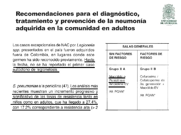 Recomendación de tratamiento empírico según Guías Colombianas 2003 SALAS GENERALES CUIDADOS INTENSIVOS IIIB IIA IIB IIIA Con factores de riesgo Sin factores de riesgo (Pseudomonas spp. ) Macrólido ó Cefuroxima/ Penicilina ó Cefalosporina 3ª + Macrólido EV Alternativa: FQN Ampicilina EV Alternativa: FQN Ceftazidima ó Cefepime ó Piperacilina/ Tazobactam + Amikacina ó Tobramicina + Macrólido ó Fluoroquinolona ó Cefepime + Ciprofloxacina