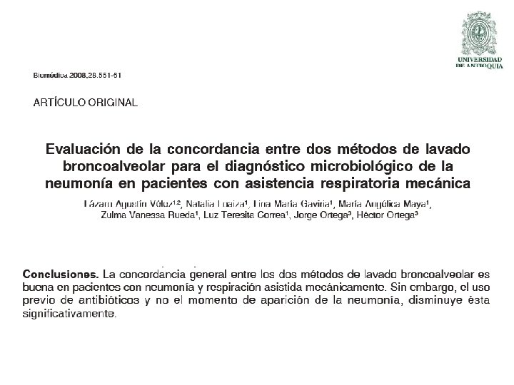 Conclusiones n n n La prevalencia de bacterias atípicas, virus respiratorios y neumonías de etiologías mixta en la región es mayor que lo previamente informado en Colombia y toda Latinoamérica Seis de los siete agentes más frecuentemente encontrados no se pueden identificar con las técnicas convencionales usadas en el laboratorio de microbiología. Lo anterior explicaría porque su presencia en el medio ha sido ampliamente ignorada hasta ahora. Se demostró que en Colombia hay casos autóctonos de L. pneumophila, Coxiella burnetii y C. pneumophila. El tratamiento empírico sugerido por las guías cubre >95% de los casos de NAC, pero induce sobreprescripción de antibióticos en cerca del 75% de ellos, incrementando eventos adversos, costos y resistencia Estos hallazgos obligan a revisar las guías colombianas de NAC Debe hacerse un estudio semejante en niños en el país