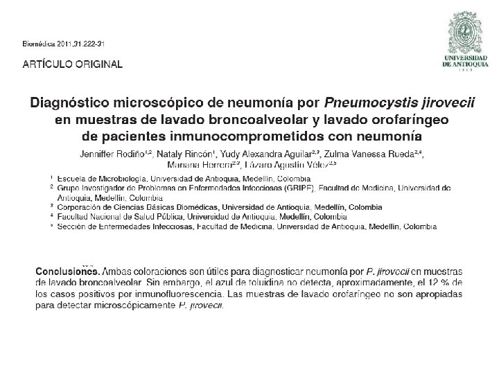 NAC Estudios colombianos más representativos Chaparro Bogotá/89 n=99 Giraldo Bogotá/93 n=104 Morales Bogotá/97 n=81 Robledo Medellín/03 n = 76 Caballero* Bogotá/08 n=138 S. pneumoniae 49 18 14. 8 30. 3 20. 3 M. pneumoniae NI NI NI 9. 2 0. 7 C. pneumoniae NI NI 2. 2 L. pneumophila NI NI 5. 1 Virus NI NI 5. 1 Haemophilus spp. 6 9. 8 3. 9 6. 5 S. aureus 9 11 7. 4 2. 6 3. 6 Otros estreptococos 9 6. 7 14. 8 NI 0. 7 Moraxella catarrhalis NI NI NI 1. 3 0 Enterobacterias 5 NI NI 2. 6 5. 1 M. tuberculosis NI NI NI 2. 6 0. 7 Mixtas NI NI NI 14. 5 8. 7 No identificado 6 34 48 31. 5 55. 8 Gérmenes (%) NI: Germen no investigado, no identificado, o sin dato * Otros=2. 9%. 1 P. jirovecii, 1 C. neoformans, 1 S. hominis, 1 P. aeruginosa