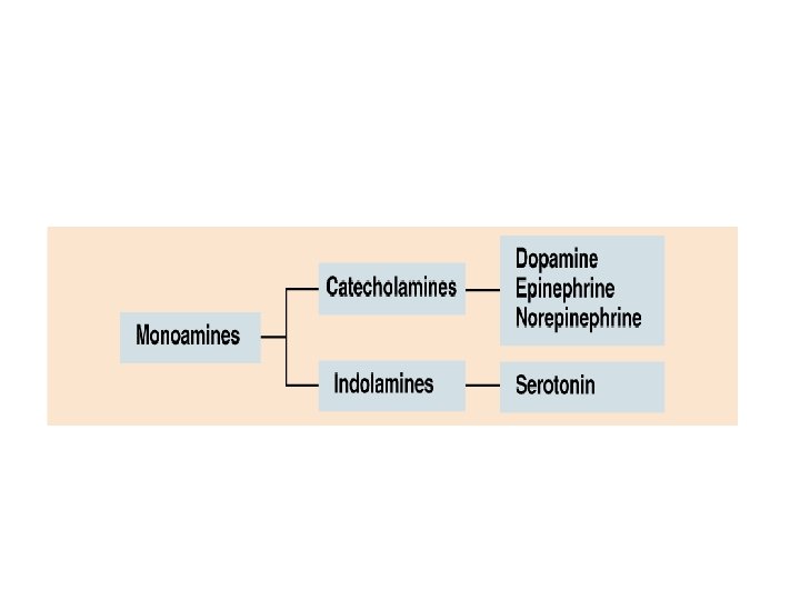 Monoamine Neurotransmitters • the catecholamines: – Dopamine • found at substantia nigra and limbic system • regulates emotion & movement – Norepinephrine • found in brain stem and subcortex • regulates emotion, reward, sleep, mood – Epinephrine • Found adrenal glands • may help regulate blood pressure